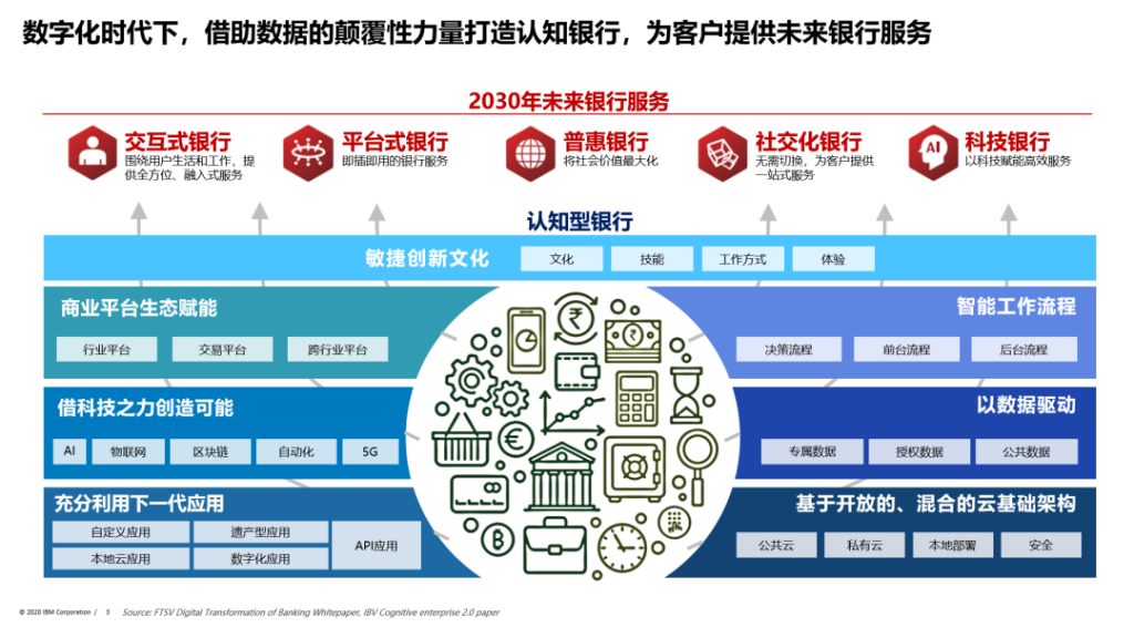 针对银行来讲,出现了越来越多的不同声音和概念。我们知道香港的virtual bank,国内的互联网银行,各种各样新的银行服务形式在出现。我甚至看到国外有一本书叫做digital bank,他说未来银行所有的流程都是API,所有的应用都是APP。我们可以看到银行传统服务的方式和阵地都在改变,特别我们可以看到不管我们现在怎么去叫它,无论叫交互式银行或者平台式银行、普惠银行、社交化银行、科技银行,叫什么不重要,但是原则上来讲我们可以看到其实最大的转型或者说最大的对于传统金融机构的痛苦不是来自于技术本身,也不是来自于是软件产品还是开源的产品。它最大的痛苦来自于文化、员工技能、工作方式对传统生态的冲击。