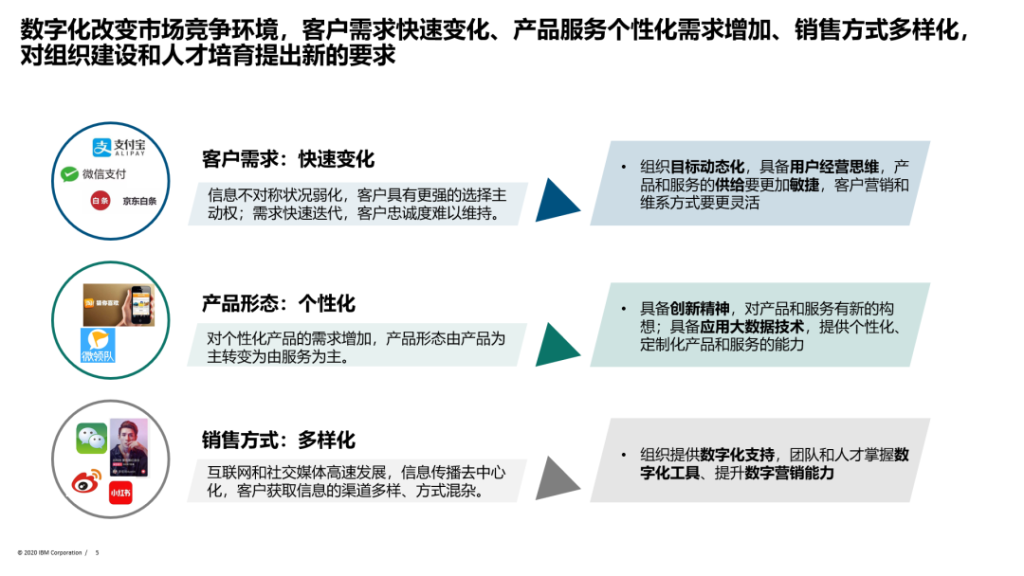 我们可以看到整个数字化改变市场竞争环境,客户需求快速变化、产品服务个性化需求增加、销售方式多样化,对组织建设和人才培育提出新的要求。很多行说我们不是不喜欢开源技术,当然我们用像TD的数字仓库、IBM的核心、SAP的各种产品,我们确实觉得成本在增加,但是它们确实好用。但是我们使用大量的开源产品后,我们发现自己的人才无法跟上,这是一个很大的问题。如何进行自己的人才培养,这是我们碰到的客户最大的痛点。我们可以看到数字化的转型不是单纯技术的转型也不是商业模式的转型,它面临着企业全方位的转型,人才、组织、团队,而且这些是相互作用,缺一不可。