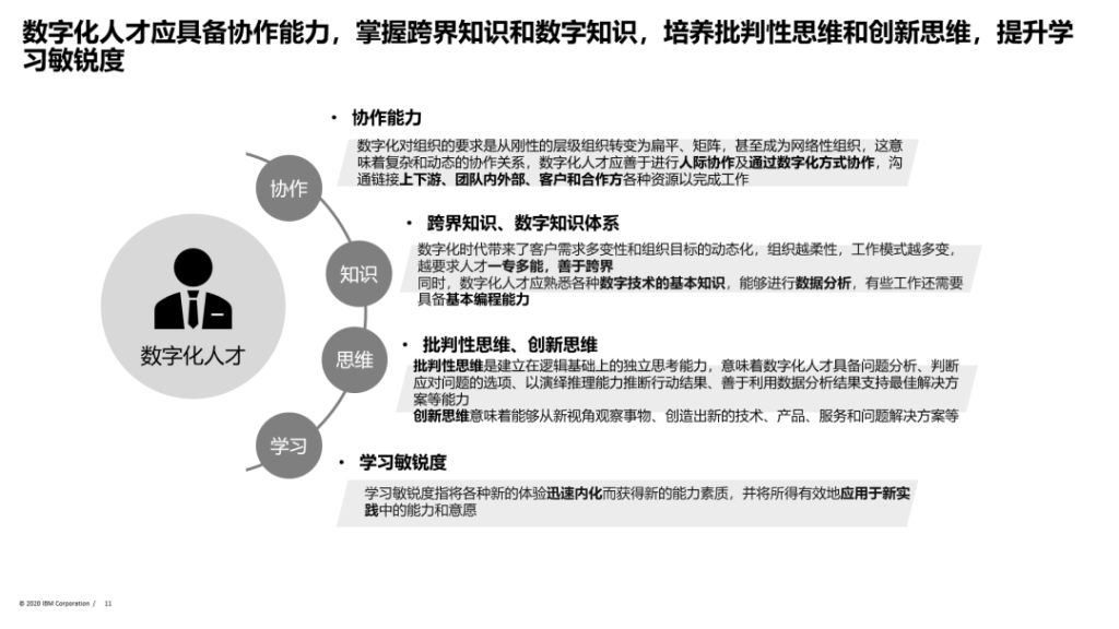 IBM去年年底推了一个叫认知型组织2.0,可能我们说的数字化转型不是你建了多少IT系统,不是做了多少平台应用,真的是数字化组织的建设,这个可能对于企业的挑战往往大过技术的本身。或者说因为我们每年有将近一千万个毕业生,不是很多企业都可以像腾讯、阿里一样,有这么大的经济实力组织大量的人员去采用开源技术,去开发自己想要的东西,大量的企业还是要借助一些服务商和技术提供方。