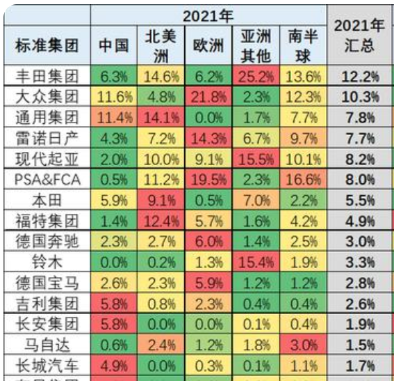 而在传统行业中,行业领先者并不是降维打击,以汽车产业为例,全世界有很多国家都有汽车品牌,全世界应该有超过30个国家有自己本土的汽车品牌,单单亚洲,日本、中国、韩国、印度、马来西亚都有本国的汽车品牌,全球领先者并没有占领整个全世界,如下图所示,汽车产业的第一名的市场份额也就是12%。