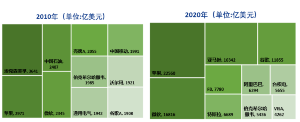 1、在过去的十年,美国股市的市值前十位基本从传统企业变成科技企业。