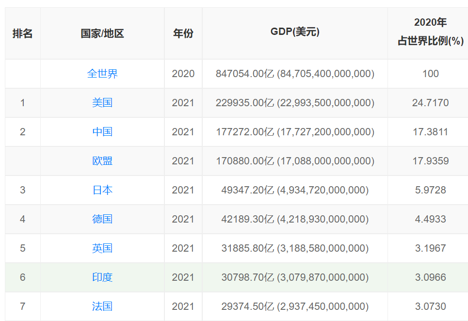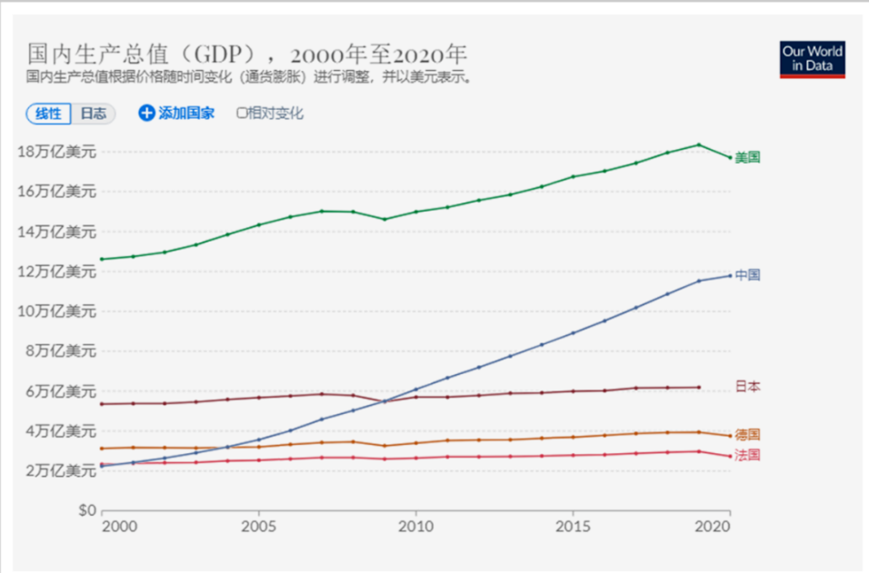 从占比的角度,美国GDP占世界比例24%,中国17%,日本占6%,德国4%,法国3%