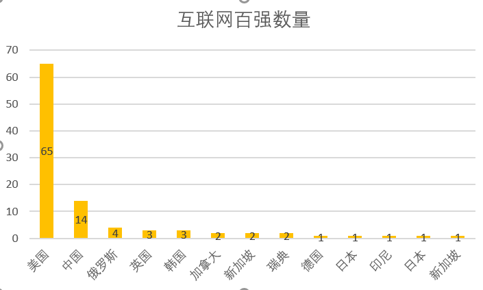 在互联网前100强中,美国占领了超过2/3的市场(65家),依靠着下面三个原因,其他所有的150多个国家勉强抢占了1/3的地盘(35家)。