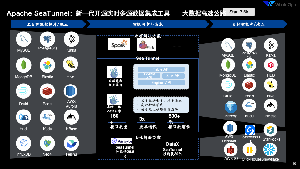 1. 流批一体化引擎架构:通过自研的 SeaTunnel Engine,实现批处理与流处理的统一支持,数据集成和同步性能比同类产品提升数十倍。同时,支持在 Spark、Flink 等引擎间无缝切换且无需更改配置,解决了传统工具中实时与离线任务需分别开发的痛点。例如,京东科技利用该特性实现订单、库存等核心链路的准实时同步,日均支撑千亿级数据处理。