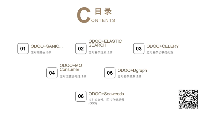 内容围绕Odoo结合开源框架可以应对的几个典型场景展开:高并发场景、复杂搜索场景、复杂长事务处理、流数据处理场景、复杂关系场景、以及多文件、图片存储场景。