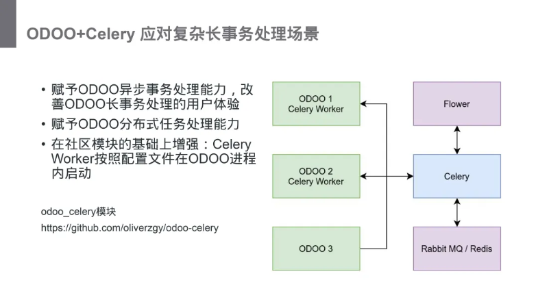 odoo 的长事务处理上,让许多用户比较诟病的地方是确认销售订单的用户体验,一旦行数过多,耗时就比较久。这里引入了 Celery 这样一个应对方式,把一些长事务的处理放到后台进行。也就是说,用户点击 confirm 的时候产生一个异步的任务,然后交到后台进行处理。本质上并不是提高了系统处理的能力,因为仍旧使用的是 odoo 的方法,只是改善了用户体验。