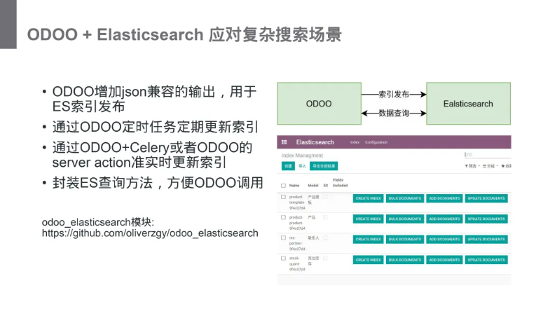 这里的挑战在于增加 json 的格式,以及如何构建索引。因为在一些特定的场景下做一个特定查询时,需要考虑如何构建索引才能达到想要的检索效果,所以索引的设计是一个挑战。在数据同步层面,odoo 的 search_read 方式,加上改造过的 search_read_json,输出 json 格式的结果发布到这个索引上,是一个天然的结构。当然,在数据量大的情况下,可能会考虑一些更好的方式。