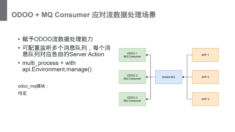 如果有了流数据的处理方式,我们是不是可以在消息过来的时候,把它在内存中经过流式处理之后再存储。基于这样的一个设想,在实践上引入了 Rabbit MQ。即,外部有很多的数据源、数据通道(APP1、2、3),把它们放到 Rabbit MQ 里面,然后产生消息队列。有了消息队列后,odoo 就可以启动 Worker,接入数据之后会有一个 callback 的处理方法,可以指定任意的用 Python 写的方法。这样,我们就实现了数据流式的处理。也就是说,这个数据是持续的产生,那我就持续地消费、持续地处理。然后把处理好的数据沉淀到不同的地方去,有沉淀到数据库的,有发布到 Redis 里面的,有发布到 Elasticsearch 上面的。有了 MQ consumer,再加上 callback 的方法,我们可以做很多流数据的处理。