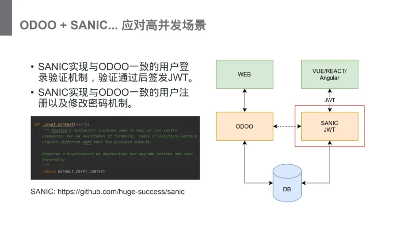 SANIC 实现的用户注册及修改密码机制也是与 odoo 一致的,功能的核心方法就是 odoo 的 def _crypt_context(),实现用户的验证(见图中代码的截图)。SANIC 只是在用户通过验证之后签发了一个 JWT 的 token。通过一个简单的改造,让并发有数量级的提升。