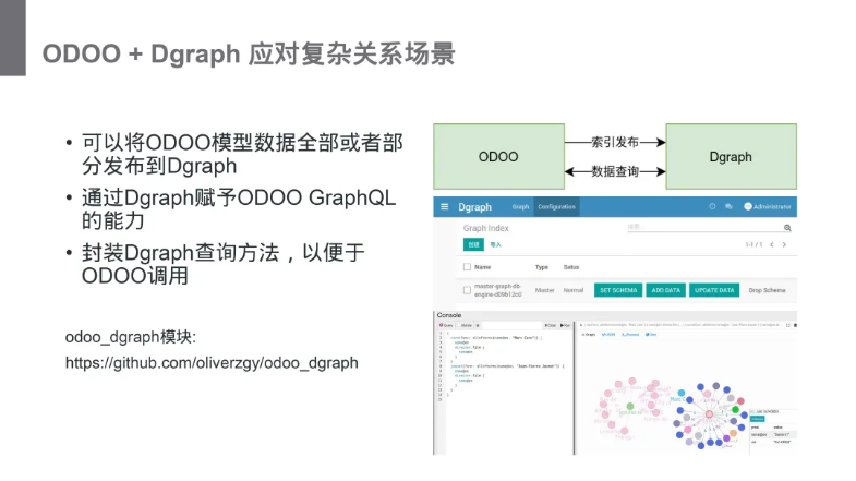 通过 Dgraph 赋予 odoo GraphQL 的能力后,可以约定进行一个 json 的查询。比方说要查询这个数据,拋一个低一层的关系:我要查询这个人的姓名是什么,他的朋友关系是什么,朋友的朋友的关系是什么?可以实现这样逐层的查询,而且这个构造天然是支持的。基于 GraphQL 查询可以提供更灵活的 restful 接口。一方面,提高了接口获取数据的能力;另一方面,开发的效率也会有很大的提升。