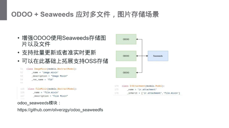 在实践中,我们定义了一个 ImageMixin 的方法,使用到了Server Action。就是数据、图片在 Mixin 这里被继承之后,在任意的 model 上面,只要你有图片这个字段,在进行配置之后就可以发布到 Seaweeds 上。这是第一个抽象。第二个抽象是对文件做的抽象,把这个文件绑定到 lr.attachment 上,只要你在 lr.attachment 上面上传了这个文件,它就天然地可以发布到 Seaweeds 服务器上。按照这个原理的话,我们可以进一步地拓展,比方说阿里的 OSS 存储,或者国内有名的七牛,或者腾讯的存储,都可以使用这个方式。这样一来,在一个高并发的场景下,这些文件、图片的读取,就不会成为系统的瓶颈。→ odoo_seaweeds模块
