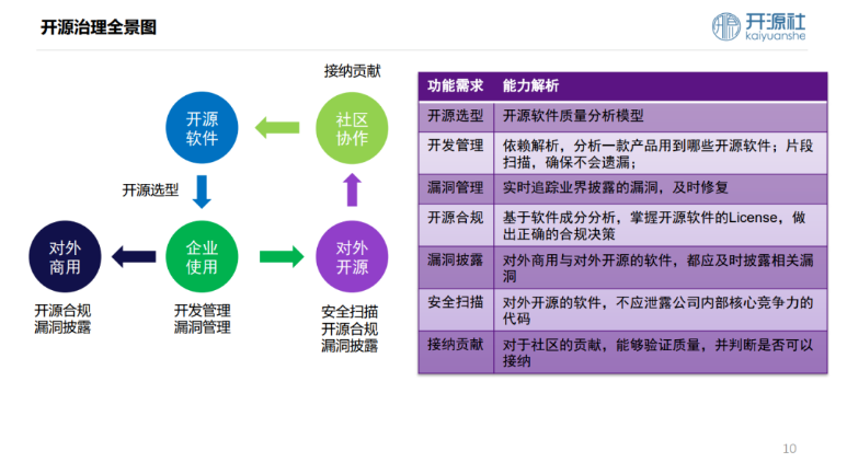 当外面的开源软件进到企业里来,我们要有一个选型的能力,即要建立一个开源软件的质量分析模型。接下来在内部开发过程中,我们要有开发管理的能力、要有漏洞管理的能力。我们要对外商用时,那么我们要交付一份我们开源的合规报告。同时,我们要及时告知用户我们的漏洞问题。当某一天我们要对外开源我们的软件时,除了要做开源合规、漏洞披露之外,我们还要做安全扫描。这个安全扫描是为了防止公司内部的核心机密泄露出去。另一方面,在社区里接纳了别人贡献的代码,我们也要做扫描,防止别人给我们贡献的代码含有恶意的、可能是无意的一些bug,我们要通过扫描保证我们吸纳进来的代码是安全的。这些工作加在一起可能是一个商业企业要考虑开源治理的各种各样的工具。