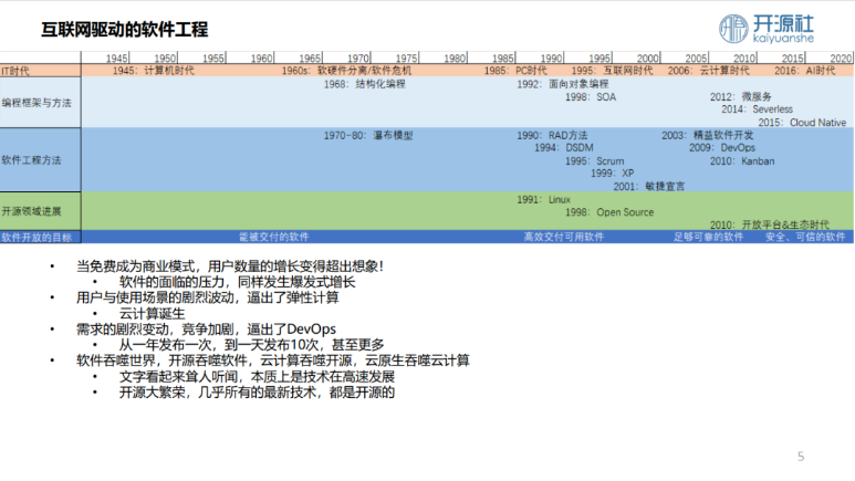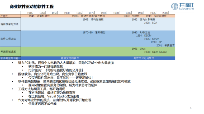 在工程方法领域开始出现RAD、DSDM、Scrum等工程方法和研发工具,到2001年的时候汇集成为敏捷宣言。这是在软件工程领域走向敏捷,之所以会有敏捷,其实是由这个商业软件所驱动出来的。作为对商业软件的反抗,自由软件/开源软件开始出现,但是还远远不成气候。1991年,Linus写了一个名叫Linux的操作系统;到了1998年,开始有了open source这个名词,但整个开源领域还非常不发达。