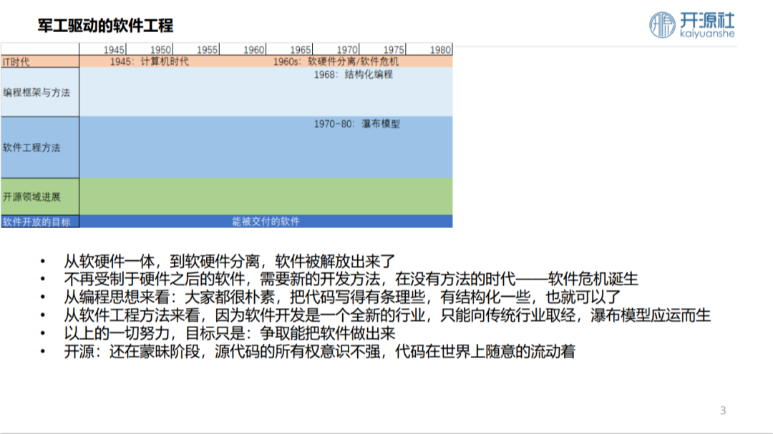 当年软件工程刚出现的时候,其实是被军事工业所驱动的,比如美国那时候做的大型的卫星、导弹、地面防御等军事系统。接下来,是商业软件驱动的软件工程、互联网驱动的软件工程和可信软件工程。